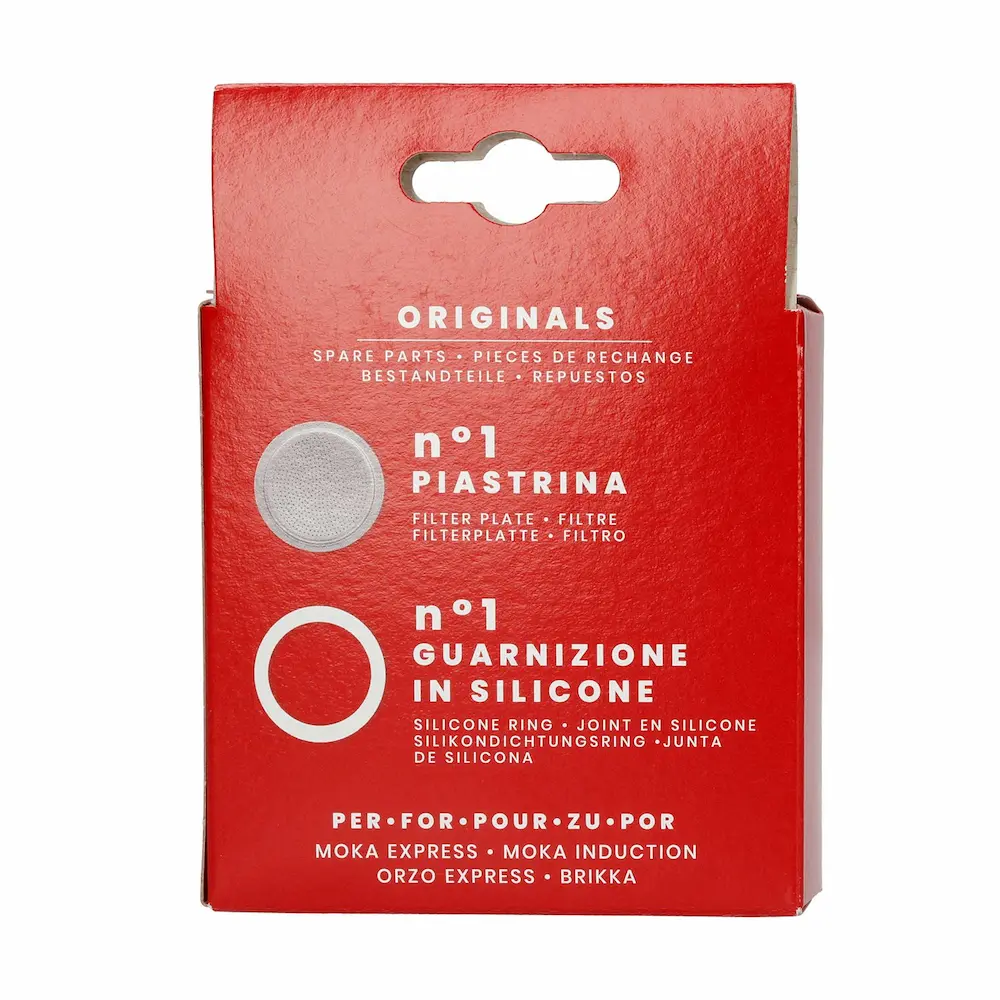 Ovaj set spada u zvaničnu kategoriju Ricambi Originali, što znači da su delovi proizvedeni po istim standardima kao i oni ugrađeni u originalnu Bialetti kafetijeru. U pakovanju se nalazi 1 perforirana metalna filter pločica (piastrina) i 1 silikonska gumica (guarnizione), namenjena Moka aparatima veličine 3/4 šoljice. Na ambalaži se navodi kompatibilnost sa modelima: Moka Express, Moka Induction, Orzo Express i Brikka, što set čini univerzalnim rešenjem za različite serije.