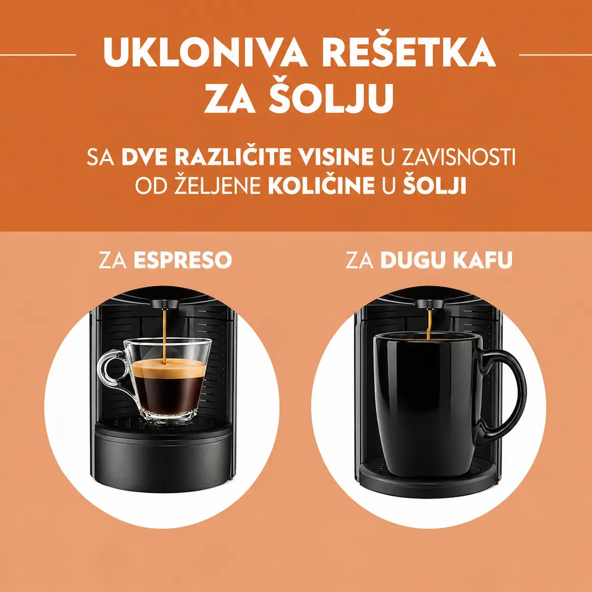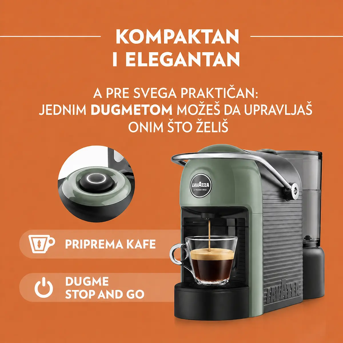Aparat je veoma jednostavan za upotrebu. Uz Stop & Go dugme, lako možete da prilagodite količinu kafe u šoljici prema sopstvenim navikama i ukusu. Ova funkcija doprinosi većoj praktičnosti u svakodnevnoj pripremi, bilo da volite kraći ili duži espresso.